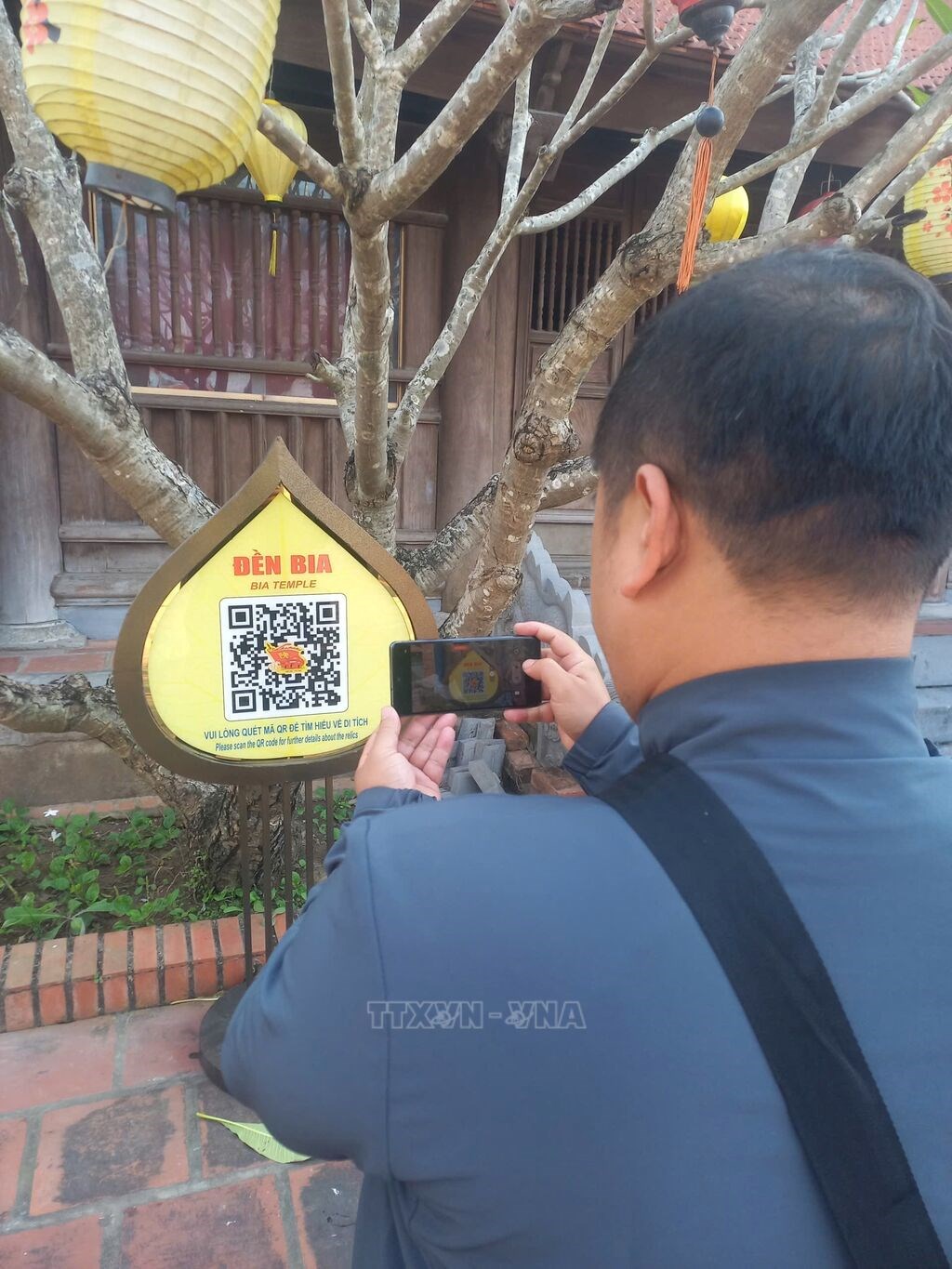 Du khách trải nghiệm quét mã QR để tìm hiểu về di tích Đền Bia. Ảnh: Mạnh Minh - TTXVN