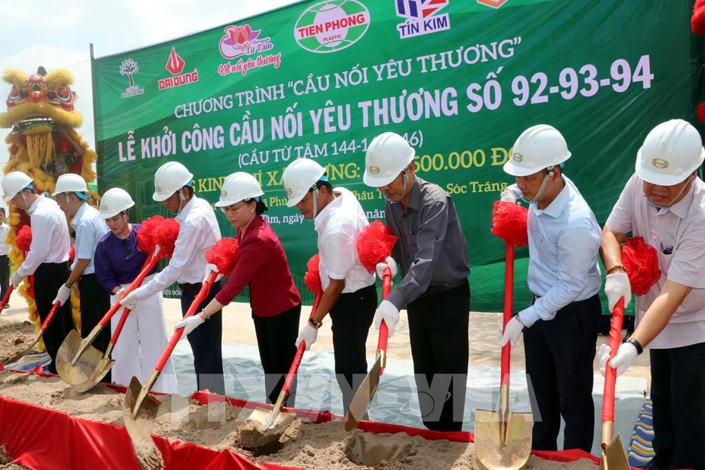 Ông Hồ Phi Hải, Tổng giám đốc Công ty cổ phần Nhựa Thiếu Niên Tiền Phong Phía Nam - đại diện nhà tài trợ cho hay, đơn vị tài trợ và thi công phấn đấu hoàn thành phục vụ người dân đi lại trước Tết Nguyên đán sắp tới. Sau khi hoàn thành, tuyến đường trong ấp dẫn ra trục đường chính của xã Phú Tâm sẽ được nối liền, tạo điều kiện thuận lợi cho việc đi lại và giao thương hàng hóa của hàng nghìn hộ dân nơi đây.Người dân sẽ không còn phải qua sông trên những chiếc cầu khỉ lắt léo, hay bằng những chuyến đò ngang nguy hiểm và tiềm ẩn nhiều rủi ro. Ba cây cầu mới không chỉ mang sứ mệnh nối nhịp đôi bờ mà còn là tiền đề cho mục tiêu xóa đói giảm nghèo, xây dựng nông thôn mới tại địa phương. Theo ông Phạm Văn Tý, Chủ tịch UBND xã Phú Tâm, huyện Châu Thành, 3 cây cầu kết nối yêu thương số 92 - 93 – 94 có thông số lần lượt dài và rộng là 22,5m x 3,5m; 28m x 3,5m và 32m x 3,5m. Cả 3 cây có tổng kinh phí xây dựng là 1,117 tỷ đồng; trong đó, các nhà tài trợ đóng góp 967,5 triệu, còn lại địa phương đối ứng 150 triệu đồng. Tại buổi lễ khởi công cụm 3 cây cầu Sóc Trăng, lãnh đạo Tỉnh ủy Sóc Trăng, UBND các cấp và nhà tài trợ đã thực hiện nghi lễ động thổ xây dựng cầu. Chương trình Cầu nối yêu thương đã dành tặng 25 phần quà và học bổng cho các em học sinh xuất sắc có hoàn cảnh khó khăn.Ngoài ra, để tri ân Ngày Nhà giáo Việt Nam 20/11 sắp tới, Chương trình Cầu nối yêu thương còn có những phần quà đặc biệt gửi tặng đến các thầy cô giáo ở 6 điểm trường trong địa bàn xã Phú Tâm./.