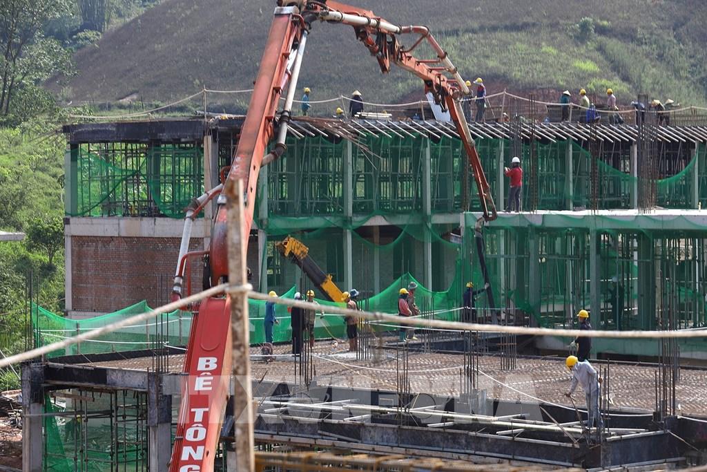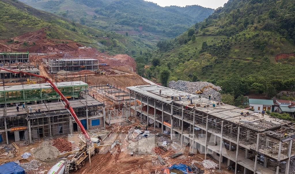 Hai nhà thầu đã huy động gần 300 nhân công cùng nhiều máy móc, thiết bị thi công đồng loạt các hạng mục bất kể ngày đêm tại điểm trường xã Xuân Nha. Ảnh: Trọng Đạt-TTXVN