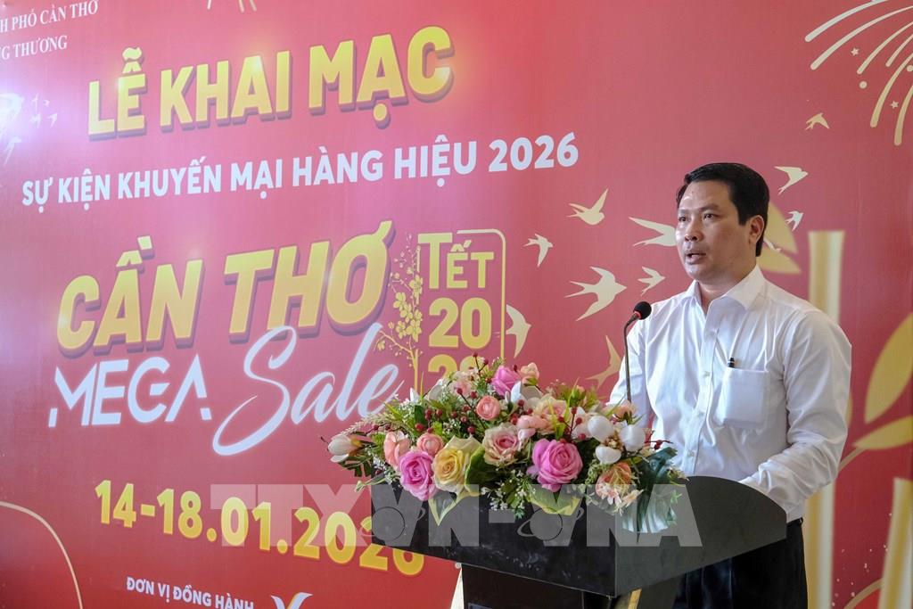 Giám đốc Sở Công thương thành phố Cần Thơ Hà Vũ Sơn phát biểu khai mạc sự kiện Cần Thơ Mega Sale 2026. Ảnh: Thanh Liêm - TTXVN