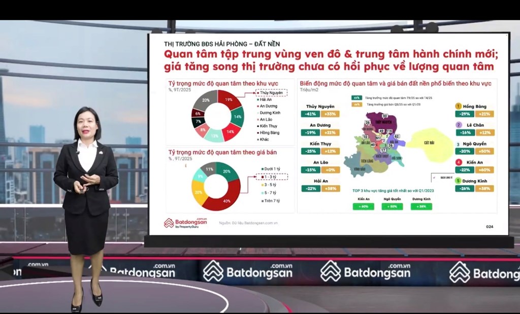 Bà Nguyễn Thị Ngọc Thương – Giám đốc chi nhánh Hải Phòng của Batdongsan.com.vn chia sẻ, thay vì tập trung vào các đô thị trung tâm, dòng tiền và nhu cầu bất động sản đang dịch chuyển mạnh mẽ ra vùng ven – nơi còn nhiều dư địa tăng trưởng và hạ tầng liên vùng ngày càng hoàn thiện.Mức độ quan tâm tại hai đô thị trung tâm trong quý III đều có dấu hiệu chững lại. Tại Hà Nội, lượng quan tâm giảm 22% so với cùng kỳ năm 2024, trong khi TP.Hồ Chí Minh gần như đi ngang hoặc giảm nhẹ 1% ở khu vực mới. Trái ngược, các tỉnh lân cận lại nổi lên như “điểm sáng”. Vùng ven Hà Nội tăng trưởng 11%. Ngoài Hà Nội, lượng quan tâm tập trung vào các khu vực Hải Phòng, Hòa Bình (cũ), Bắc Giang (cũ).Bức tranh bất động sản miền Bắc quý III cho thấy xu hướng dịch chuyển rõ rệt ra ngoài Hà Nội. Các địa bàn Hải Phòng, Hưng Yên, Hòa Bình (cũ) và Bắc Giang (cũ) trở thành “tâm điểm” khi chiếm tới 80% tổng mức độ quan tâm toàn khu vực. Trong đó, Hải Phòng giữ vị trí số một với chỉ số 100, Hưng Yên đứng thứ hai (62) và Bắc Ninh (35) xếp thứ ba – bà Thương thông tin.Xét về tốc độ tăng trưởng so với đầu năm, Hòa Bình (cũ) dẫn đầu với 65%, tiếp đến là Bắc Giang (cũ) 61%, Hải Phòng 50% và Bắc Ninh 48%). Các địa bàn khác như Quảng Ninh, Hưng Yên, Vĩnh Phúc (cũ) cũng duy trì đà tăng 26-42%. Sự bùng nổ này phản ánh xu hướng dịch chuyển vốn ra các đô thị vệ tinh quanh Hà Nội - nơi giá còn cạnh tranh, hạ tầng kết nối thuận lợi và tiềm năng dài hạn mở rộng.Tin liên quan