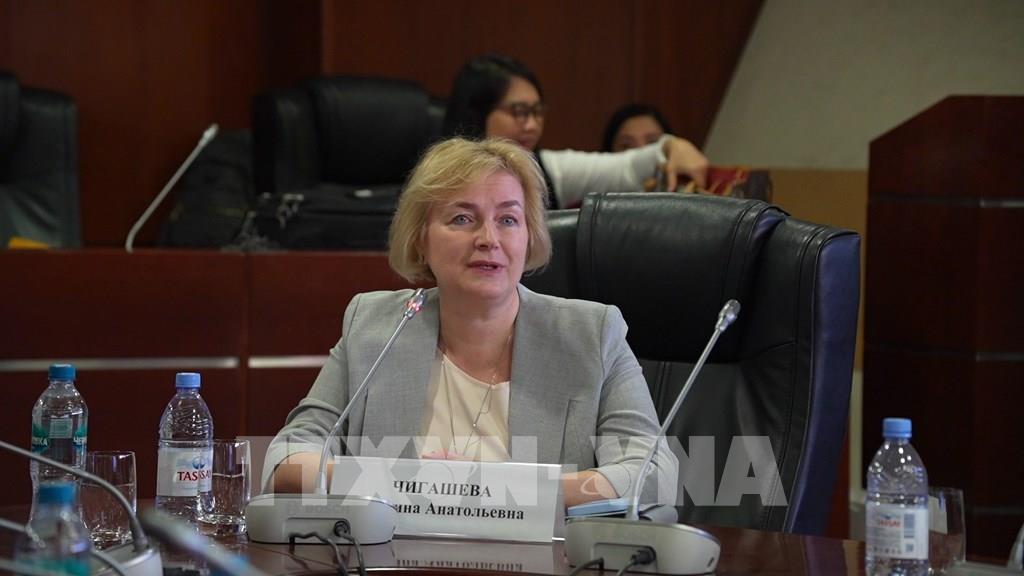 Bà Marina Chigasheva, Trưởng bộ môn Đào tạo Ngôn ngữ tại MGIMO, phát biểu khẳng định sức hút của tiếng Việt và nhu cầu thực tế về nguồn nhân lực phiên dịch chất lượng cao tại Nga. Ảnh: Trần Hải - PV TTXVN tại Nga