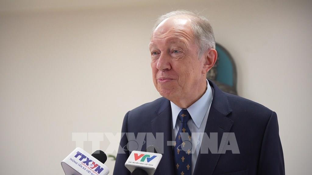 Ông Andrey Tatarinov, cựu Đại sứ Nga tại Việt Nam, Chủ tịch Ban Giám khảo trả lời phỏng vấn TTXVN tại Nga về kết quả cuộc thi. Ảnh: Trần Hải - PV TTXVN tại Nga
