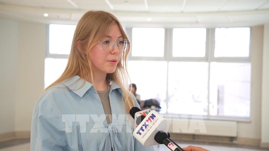 Em Alla, sinh viên năm thứ ba trường Đại học Ngôn ngữ Quốc gia Moskva đạt giải thưởng về tốc độ dịch, chia sẻ cảm xúc hồi hộp khi vừa bước ra từ cuộc thi. Ảnh: Trần Hải - PV TTXVN tại Nga