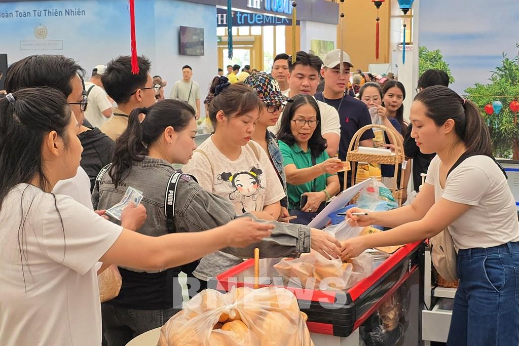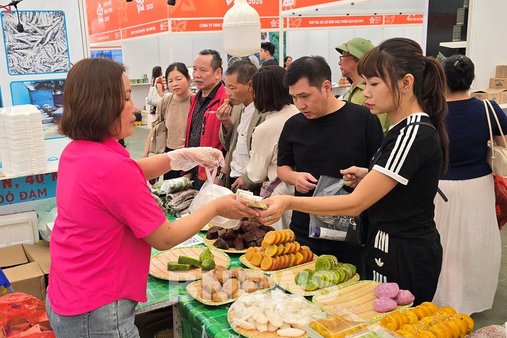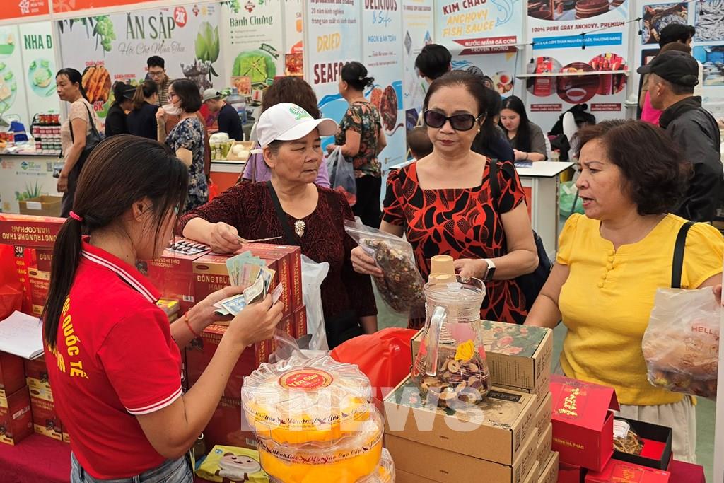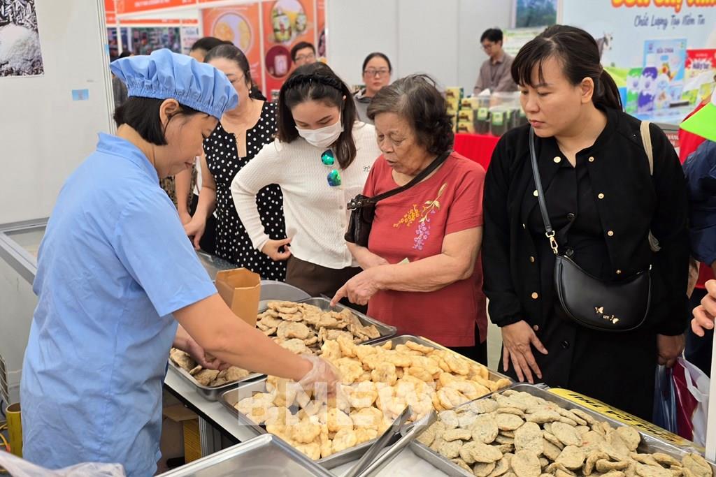 Giữa không gian hội chợ rộn ràng, khu ẩm thực nổi bật là khu vực sôi động nhất, nơi du khách được thưởng thức hương vị Việt qua hàng trăm món ngon truyền thống. Ảnh: Lê Phương/Bnews/vnanet.vn Khách tham quan hào hứng dùng thử món bánh chưng, quẩy chiên, trà sữa cốm... của Nương Bắc. Ảnh: Lê Phương/Bnews/vnanet.vn