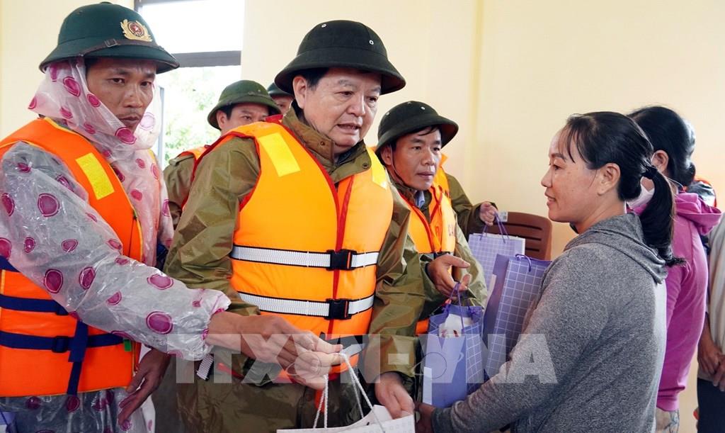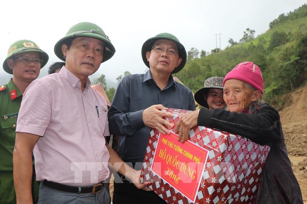 Phó Thủ tướng Mai Văn Chính tặng quà, động viên người dân vùng rốn lũ Hữu Tân (xã Ninh Châu, tỉnh Quảng Trị). Ảnh: Tá Chuyên - TTXVN