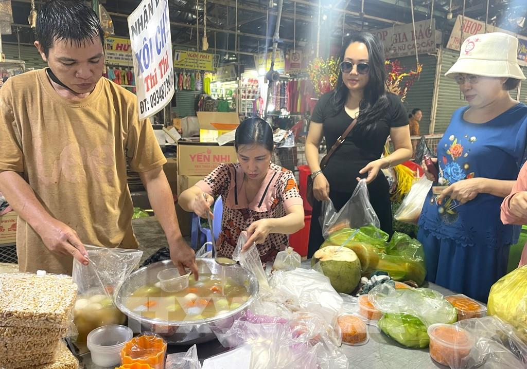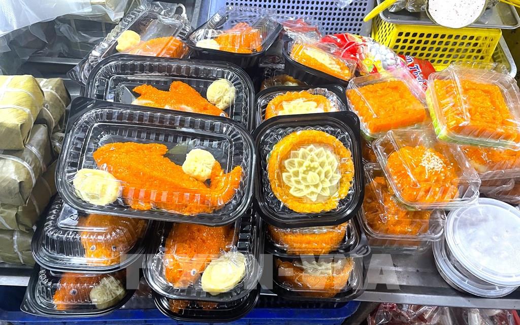 Sạp xôi chè hút khách trong dịp cúng ông Công ông Táo. Ảnh: Hương Giang - TTXVN