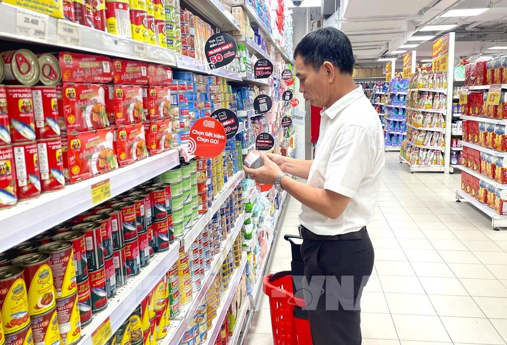 Người dân thận trọng tìm hiểu thông tin sản phẩm đồ hộp trước khi mua, tại một siêu thị trên đường Nguyễn Thị Thập, TP. Hồ Chí Minh. Ảnh: Hương Giang - TTXVN
