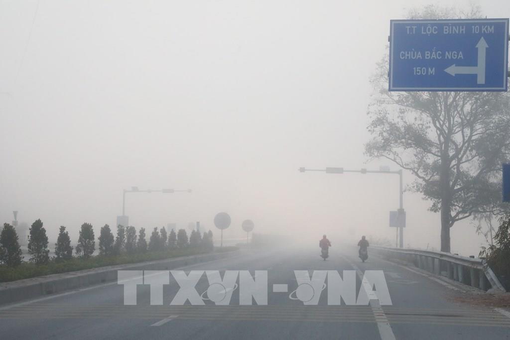 Sáng 10/1, rên Quốc lộ 4B, qua địa bàn phường Kỳ Lừa, tỉnh Lạng Sơn, sương mù vẫn khá dày làm hạn chế tầm nhìn của người và phương tiện tham gia giao thông. Ảnh: Văn Đạt - TTXVN