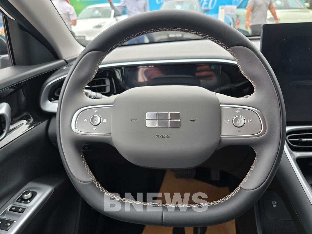 Vô lăng Geely EX5 EM-i dạng vát đáy và nhiều phím bấm chức năng. Ảnh: Văn Xuyên/BNEWS/TTXVN