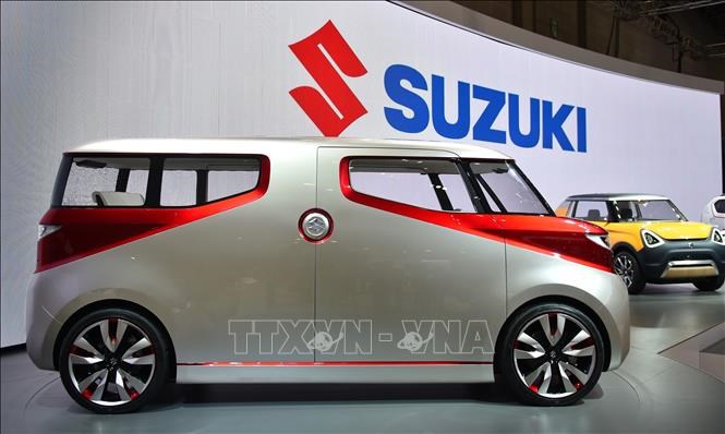 Sản phẩm ô tô và biểu tượng của hãng Suzuki Motor tại triển lãm xe Tokyo. Ảnh: AFP/TTXVN