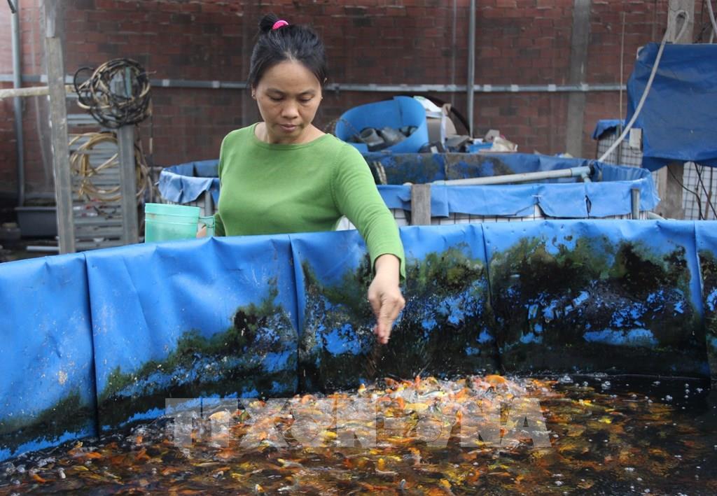 Chăm sóc cá koi cảnh tại bể nuôi mô hình aquaponics. Ảnh tư liệu: Xuân Dự - TTXVN