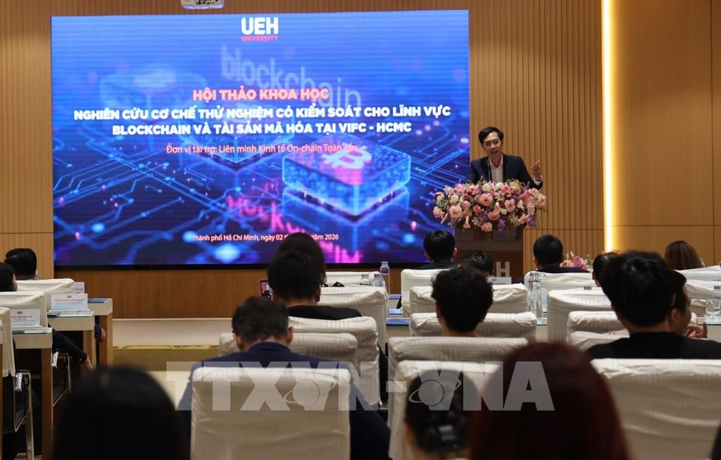 Đại học Kinh tế TP. Hồ Chí Minh (UEH) phối hợp với Liên minh Kinh tế On-chain Toàn cầu (GOE Alliance) tổ chức Hội thảo khoa học với chủ đề “Nghiên cứu cơ chế thử nghiệm có kiểm soát cho lĩnh vực blockchain và tài sản mã hóa tại Trung tâm tài chính quốc tế TP. Hồ Chí Minh (VIFC-HCMC)”. Ảnh: Hứa Chung-TTXVN