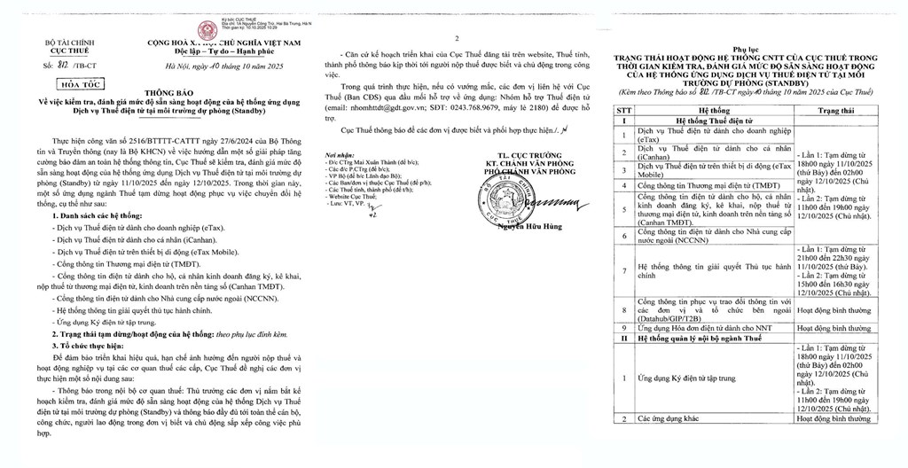 Theo Thông báo số 813/TB-CT, việc kiểm tra được thực hiện căn cứ Công văn số 2516/BTTTT-CATTT ngày 27/6/2024 của Bộ Thông tin và Truyền thông (nay là Bộ Khoa học và Công nghệ) về việc hướng dẫn tăng cường bảo đảm an toàn hệ thống thông tin. Cục Thuế cho biết, việc kiểm tra, đánh giá mức độ sẵn sàng của hệ thống Dịch vụ Thuế điện tử tại môi trường dự phòng sẽ diễn ra từ ngày 11/10 đến ngày 12/10. Trong thời gian này, một số ứng dụng ngành Thuế sẽ tạm dừng hoạt động để phục vụ quá trình chuyển đổi hệ thống. Cụ thể, hệ thống Dịch vụ Thuế điện tử tạm dừng 8 giờ lần 1 từ 18h00 ngày 11/10 (Thứ bảy) đến 02h00 ngày 12/10 (Chủ nhật) và lần 2 từ 11h00 đến 19h00 ngày 12/10 (Chủ nhật). Hệ thống thông tin giải quyết thủ tục hành chính tạm dừng 1 giờ 30 phút lần 1 từ 21h00 đến 22h30 ngày 11/10 (Thứ bảy) và lần 2 từ 15h00 đến 16h30 ngày 12/10 (Chủ nhật). Cục Thuế cho biết, phạm vi ảnh hưởng trong thời gian tạm dừng bao gồm việc người nộp thuế tạm thời không thể sử dụng các ứng dụng, dịch vụ như: Dịch vụ Thuế điện tử dành cho doanh nghiệp (eTax); Dịch vụ Thuế điện tử dành cho cá nhân (iCanhan); Dịch vụ Thuế điện tử trên thiết bị di động (eTax Mobile); Cổng thông tin Thương mại điện tử; Cổng thông tin dành cho hộ, cá nhân kinh doanh kê khai, nộp thuế từ thương mại điện tử và nền tảng số (Canhan TMĐT); Cổng thông tin dành cho Nhà cung cấp nước ngoài; Dịch vụ Thuế điện tử trên Cổng Dịch vụ công Quốc gia và Cổng Dịch vụ công Bộ Tài chính; Hệ thống thông tin giải quyết thủ tục hành chính của ngành thuế. Tại Thông báo số 812/TB-CT, để đảm bảo triển khai hiệu quả, hạn chế ảnh hưởng đến người nộp thuế và hoạt động nghiệp vụ tại các cơ quan thuế các cấp Cục Thuế yêu cầu các Ban, đơn vị thuộc Cục Thuế và Cục Thuế các tỉnh, thành phố thực hiện nghiêm túc các nội dung: thông báo kế hoạch kiểm tra, đánh giá mức độ sẵn sàng của hệ thống tới toàn thể cán bộ, công chức, người lao động để chủ động bố trí công việc; thông tin kịp thời tới người nộp thuế qua các kênh của cơ quan thuế địa phương để họ nắm bắt, chủ động trong giao dịch.- Từ khóa :