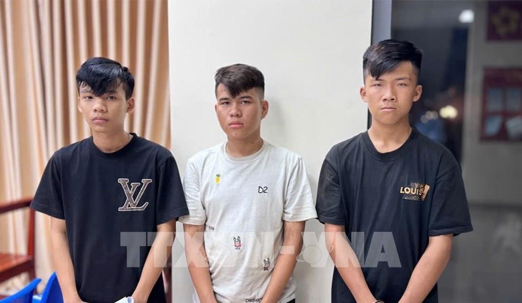 Các đối tượng Khánh, Sang và Thế (từ trái qua) tại cơ quan công an. Ảnh: TTXVN phát