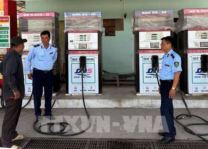 Đội quản lý thị trường tỉnh Cà Mau tăng cường kiểm tra tại các cửa hàng kinh doanh xăng dầu. Ảnh: Tuấn Phi - TTXVN