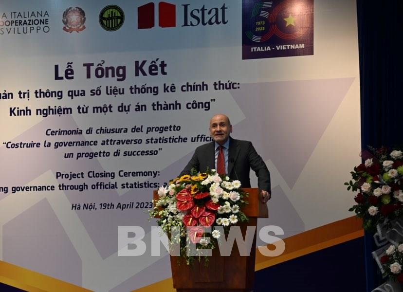 Thông tin về Dự án “Cải thiện hệ thống thống kê quốc gia Việt Nam”, ngài Antonio Alessandro, Đại sứ đặc mệnh toàn quyền Italia tại Việt Nam cho biết, tổng giá trị của dự án là 650 nghìn euro cho thời gian 5-6 năm. Ảnh: Thúy Hiền/BNEWS/TTXVN