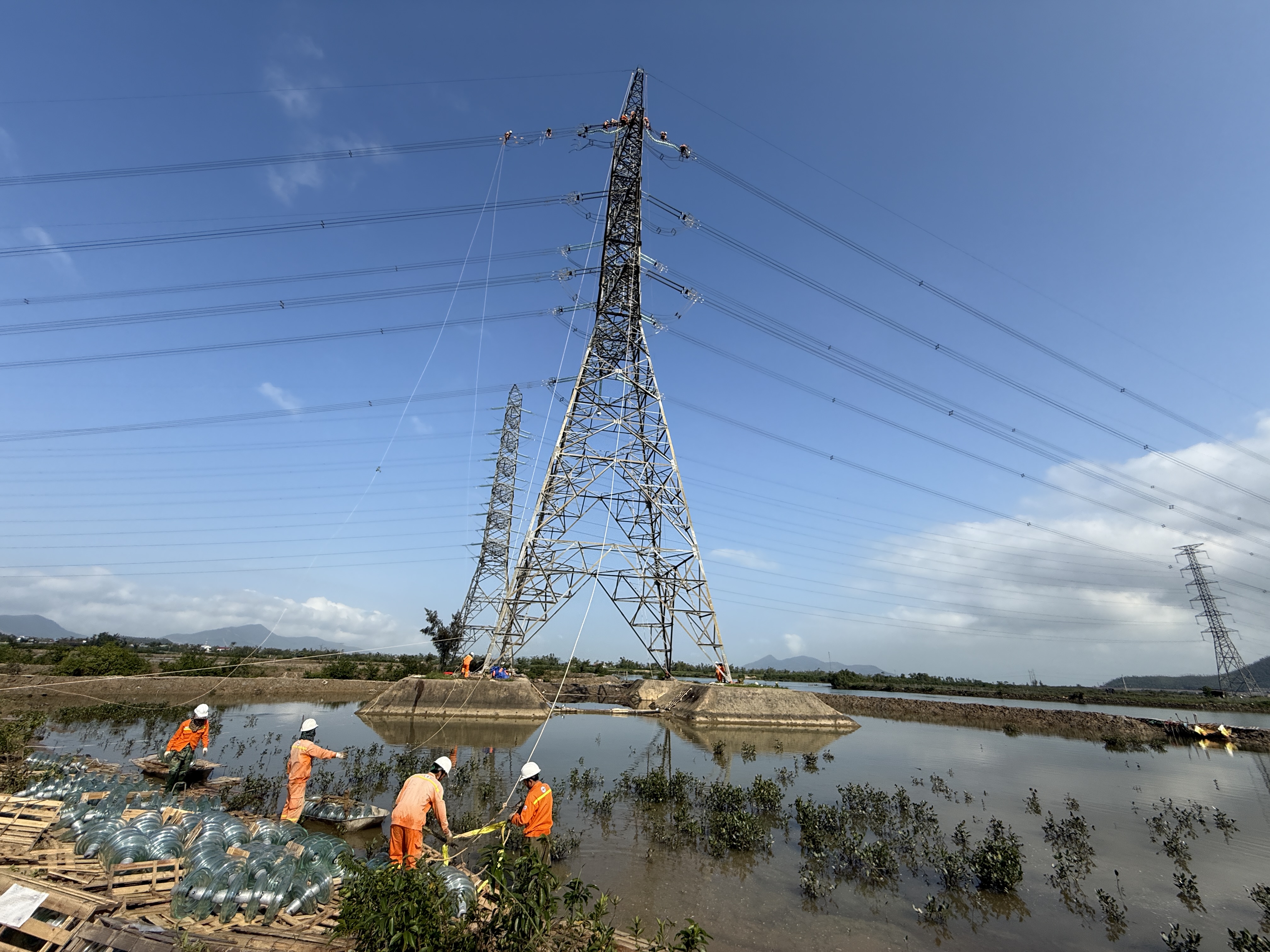 Tại vị trí 15B đường dây 500kV Vũng Áng - Quảng Trị, không khí lao động thật hăng say khi từng tốp công nhân, người dưới nước, người trên cột khẩn trương thao tác các công việc của mình. Anh Lê Hồng Hùng, Tổ trưởng Tổ quản lý vận hành đường dây Hà Tĩnh, Truyền tải điện Hà Tĩnh, chỉ huy trực tiếp thi công cho biết: Đơn vị được giao thay toàn bộ ba pha cách điện của tuyến đường dây này. Khu vực này gần biển, cho nên để đảm bảo vận hành an toàn, lâu dài, bền vững thì việc thay cách điện thủy tinh truyền thống là rất cần thiết.
