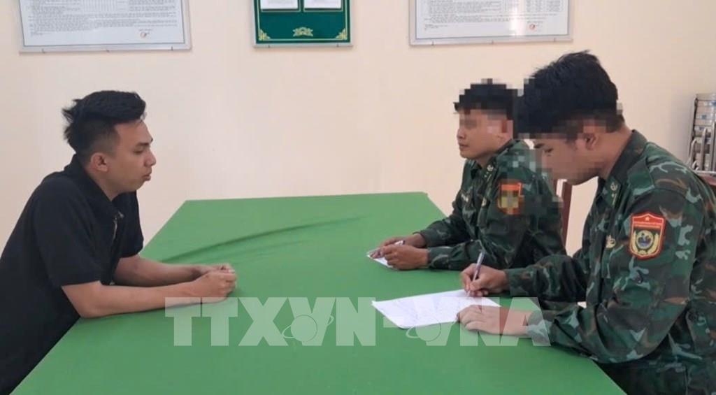 Đối tượng Nguyễn Văn Thuận làm việc với cán bộ Đồn Biên phòng Long Khốt sau khi bị phát hiện sau khi nhập cảnh trái phép từ Campuchia vào Việt Nam. Ảnh: TTXVN phát
