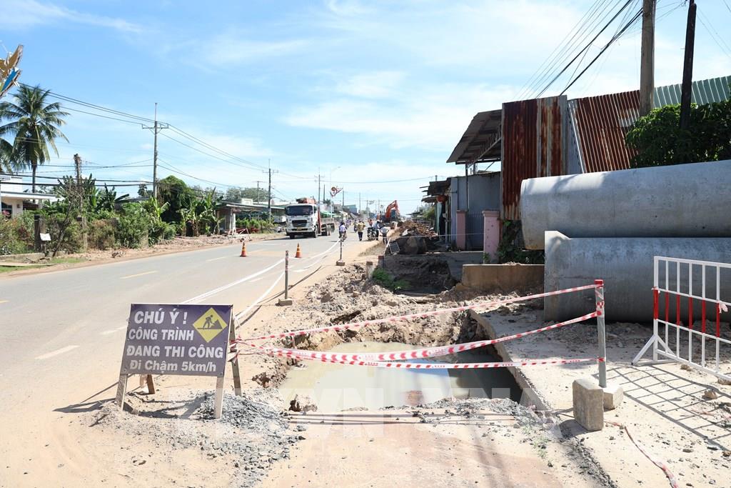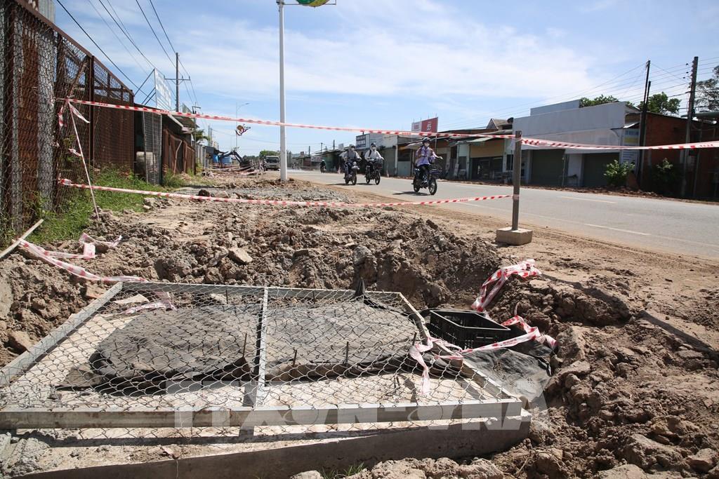Các cống thoát nước trong quá trình thi công được rào chắn nhằm đảm bảo an toàn giao thông. Ảnh: Thanh Tân – TTXVN