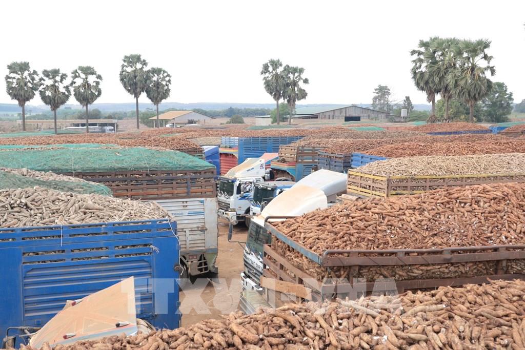Hàng trăm xe chở sắn tươi ùn ứ tại Cửa khẩu Chàng Riệc. Ảnh: Thanh Tân - TTXVN
