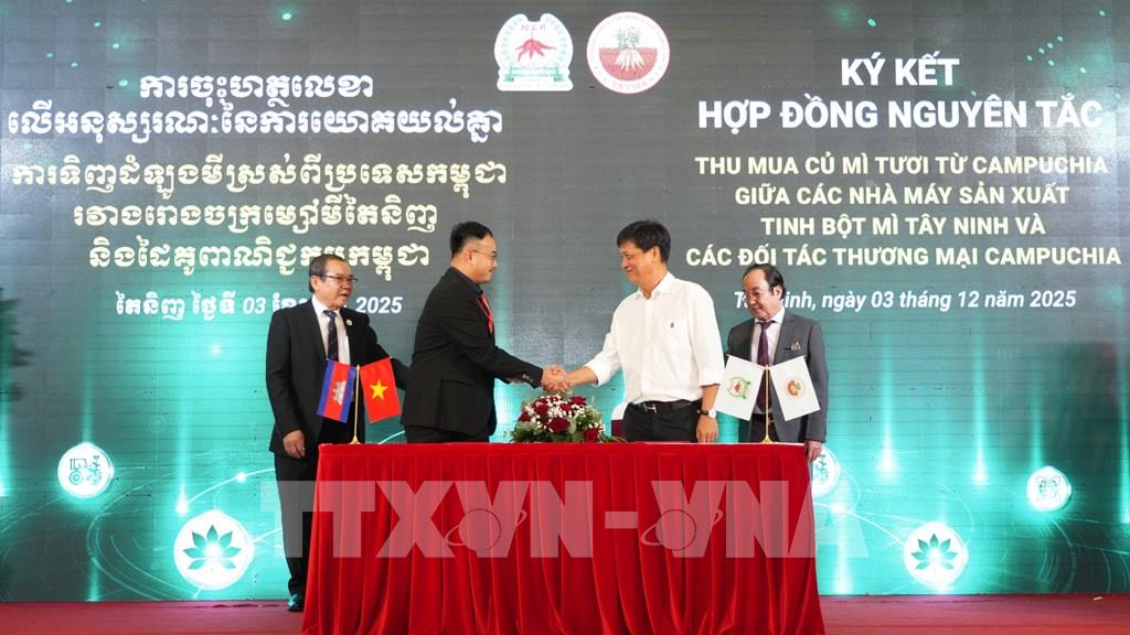 Các doanh nghiệp sản xuất tinh bột sắn tỉnh Tây Ninh và các đối tác thương mại tại Campuchia thực hiện ký kết Hợp đồng Nguyên tắc thu mua củ sắn tươi từ Campuchia. Ảnh: Minh Phú - TTXVN