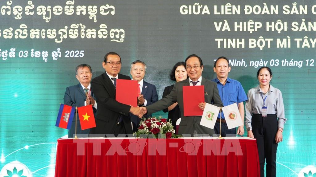 Lễ ký kết Biên bản ghi nhớ (MoU) giữa Liên đoàn sắn Campuchia và Hiệp hội Sản xuất tinh bột mì Tây Ninh. Ảnh: Minh Phú – TTXVN