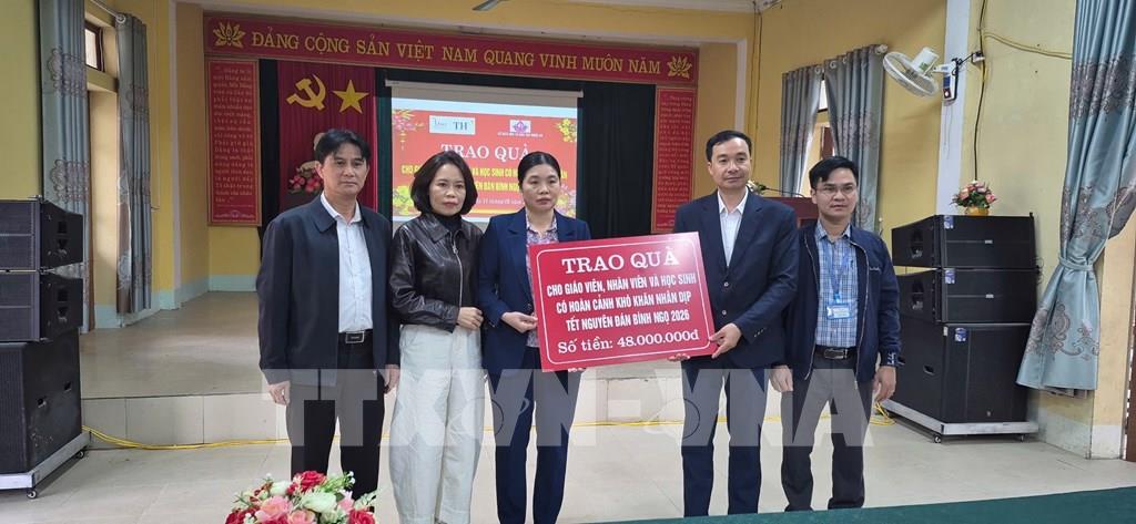 Lãnh đạo Sở Giáo dục và Đào tạo trao quà Tết cho các trường học trên địa bàn xã Hùng Chân. Ảnh: Bích Huệ - TTXVN