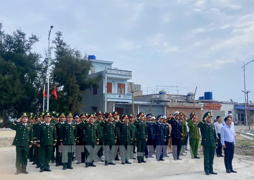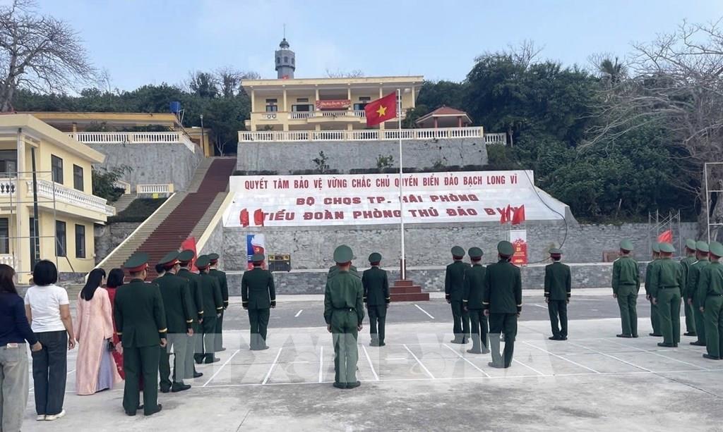 Cán bộ, chiến sĩ Tiểu đoàn Phòng thủ đảo Bạch Long Vĩ cùng quân, dân đặc khu Bạch Long Vĩ trang nghiêm dự Lễ chào cờ chủ quyền vào mùng 1 Tết Nguyên đán Bính Ngọ. Ảnh: TTXVN phát.
