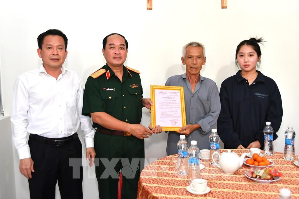 Thiếu tướng Nguyễn Văn Ngành, Chỉ huy trưởng Bộ CHQS tỉnh An Giang, bàn giao nhà Đại đoàn kết cho gia đình ông Võ Văn Thảnh (ấp Hòa Giang, xã Hòa Điền). Ảnh: Văn Sĩ - TTXVN