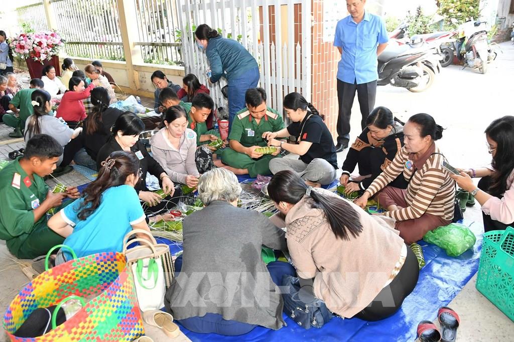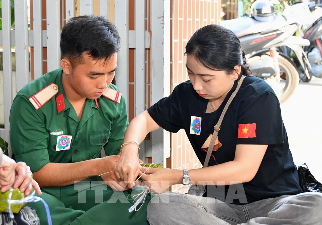 Chiến sĩ Tiểu đoàn 207 và đoàn viên thanh niên xã Hòa Điền tham gia hội thi gói bánh tét trong chương trình Tết Quân – Dân 2026. Ảnh: Văn Sĩ - TTXVN