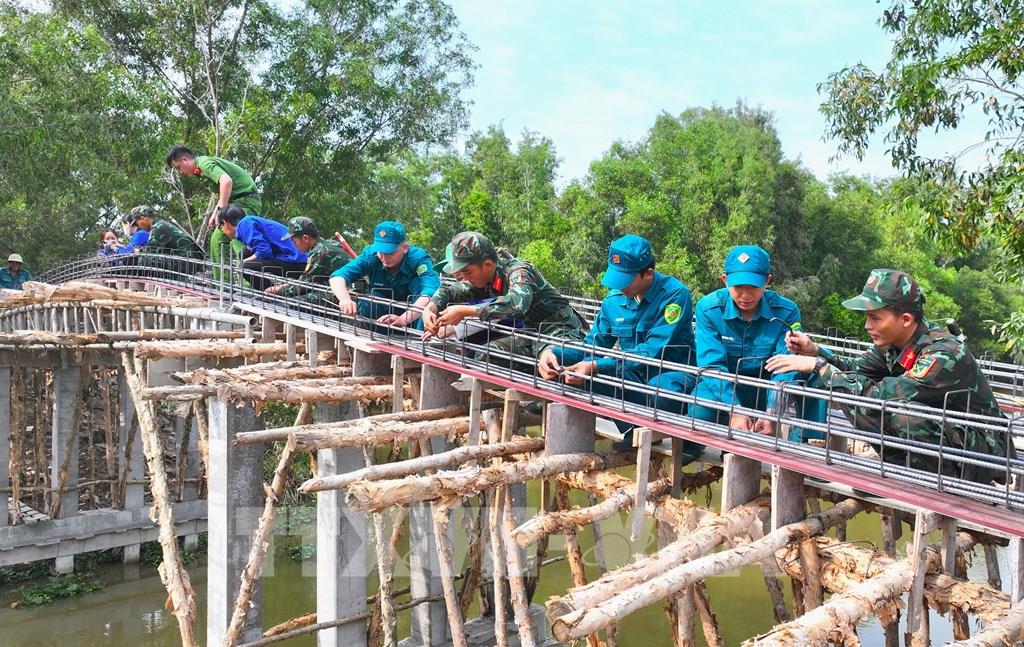 Cán bộ, chiến sĩ Tiểu đoàn 207 phối hợp cùng đoàn viên thanh niên và người dân địa phương xây dựng cầu Kênh 9, ấp Tân Điền, xã Hòa Điền. Ảnh: Văn Sĩ - TTXVN