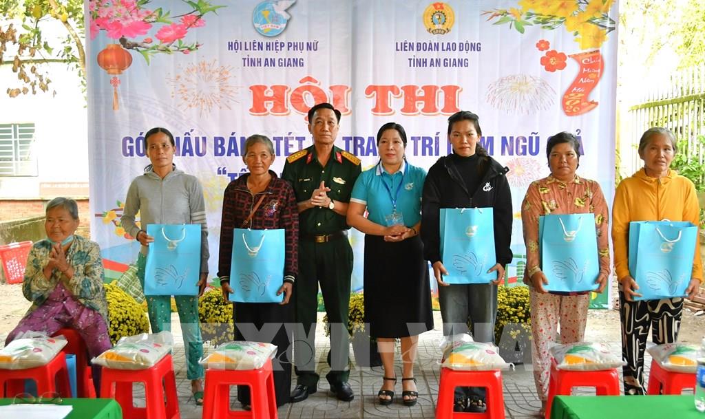 Đại tá Cao Minh Tâm, Phó Chính ủy Bộ CHQS tỉnh và Phó Chủ tịch Hội LHPN tỉnh An Giang Lê Thị Ngọc Dung trao quà cho người dân khó khăn xã Hòa Điền dịp tết Quân - Dân 2026. Ảnh: Văn Sĩ - TTXVN