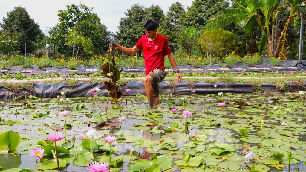 Thay vì chỉ khai thác kinh tế từ vườn sầu riêng theo cách truyền thống, chị tận dụng trồng các loại hoa súng giống ngoại, chủ yếu là súng kiểng giống Thái và Australia với khoảng 100 mặt hoa đủ màu từ đơn sắc đến đa sắc.