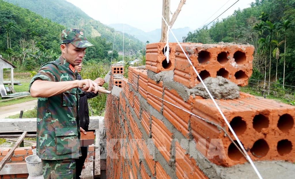 Các cán bộ, chiến sĩ Ban chỉ huy Phòng thủ khu vực 1 - Sơn Tịnh, Bộ chỉ huy Quân sự tỉnh Quảng Ngãi thi công nhà ở cho các hộ dân Tây Trà. Ảnh: Lê Phước Ngọc – TTXVN