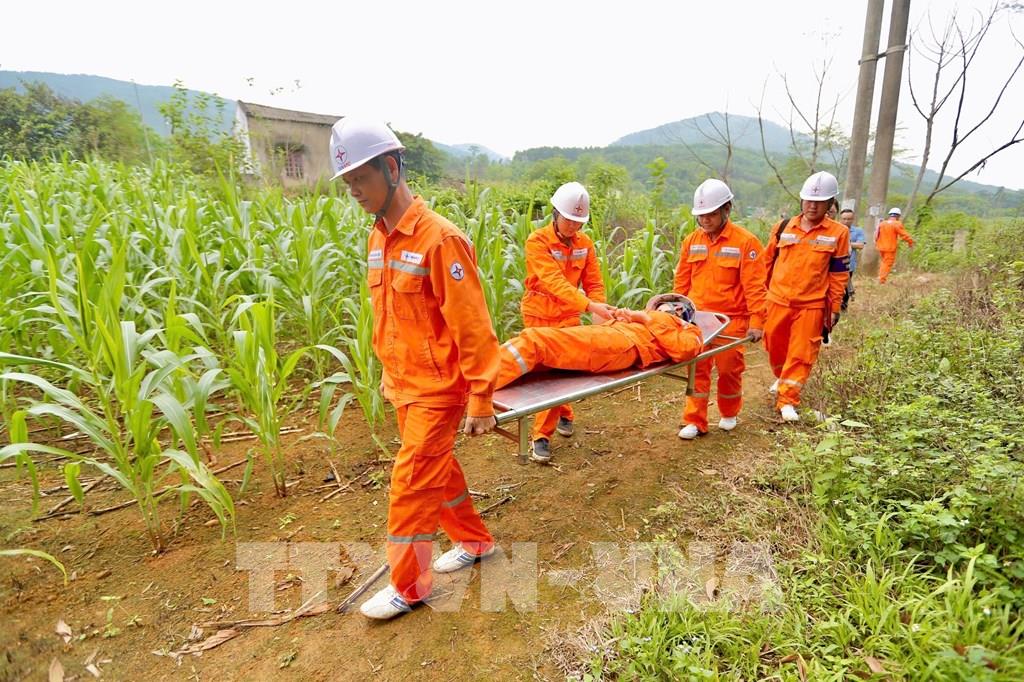 Công ty Điện lực Thanh Hóa thực hiện tình huống giả định sơ cứu đưa công nhân bị gãy tay trong khi đi kiểm tra đường dây sự cố đến cơ sở y tế. Ảnh Khiếu Tư - TTXVN