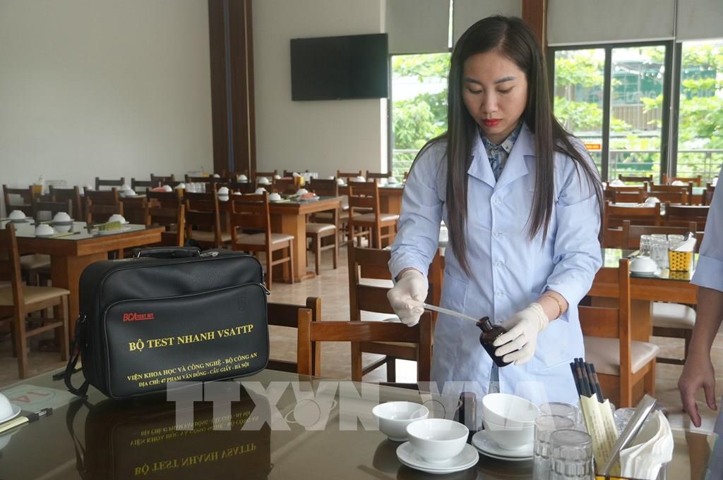 Test nhanh vệ sinh an toàn thực phẩm tại 1 cơ sở ăn uống tại phường Sầm Sơn. Ảnh: Hoa Mai - TTXVN