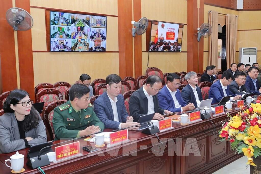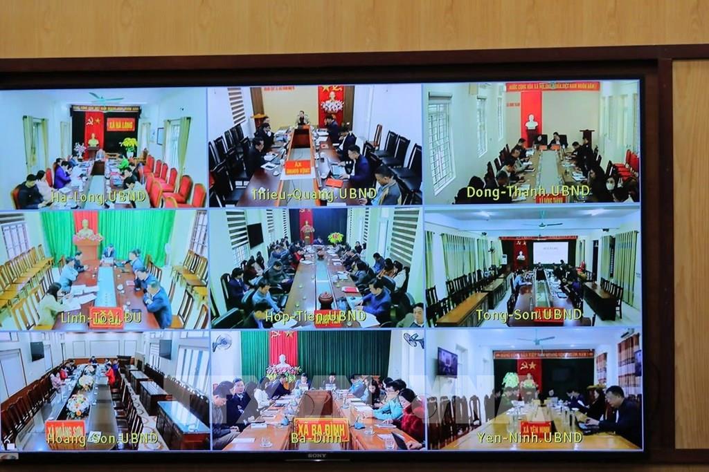 Hội nghị được kết nối từ điểm cầu UBND tỉnh tới 166 xã, phường trong tỉnh. Ảnh: Hoa Mai - TTXVN