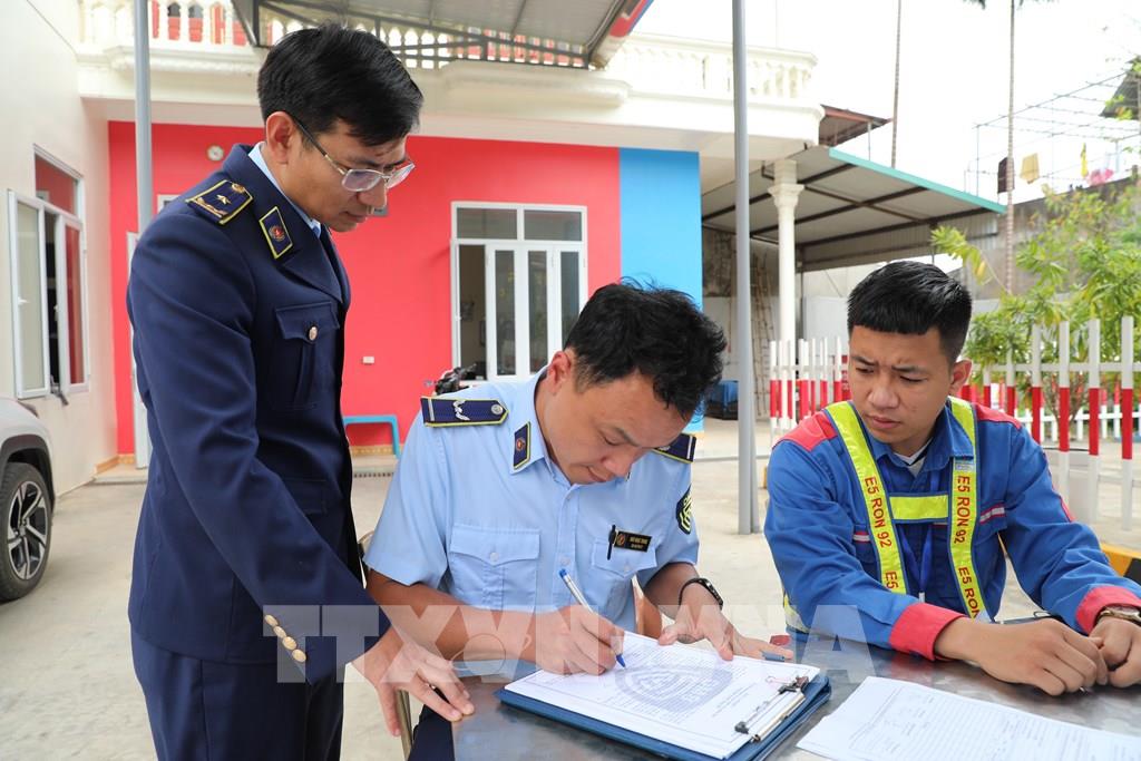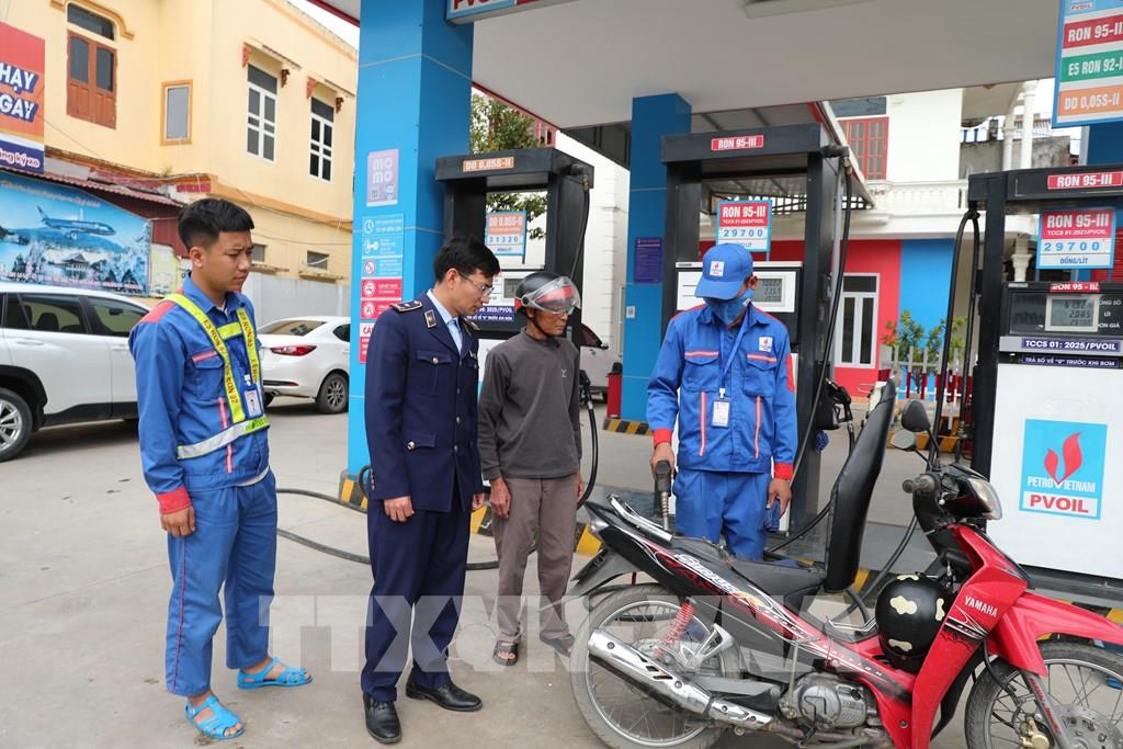 Cán bộ Đội Quản lý thị trường số 6, Chi cục QLTT Thanh Hóa có mặt tại cửa hàng xăng dầu để nắm bắt tình hình cung ứng, ổn định thị trường khi giá xăng biến động. Ảnh: Khiếu Tư - TTXVN