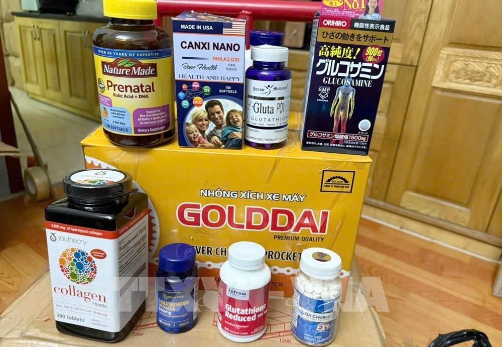 Quá trình khám xét, Công an tỉnh Thanh Hóa đã thu giữ tổng cộng 7.170 hộp thuốc, thực phẩm các loại. Ảnh: TTXVN phát