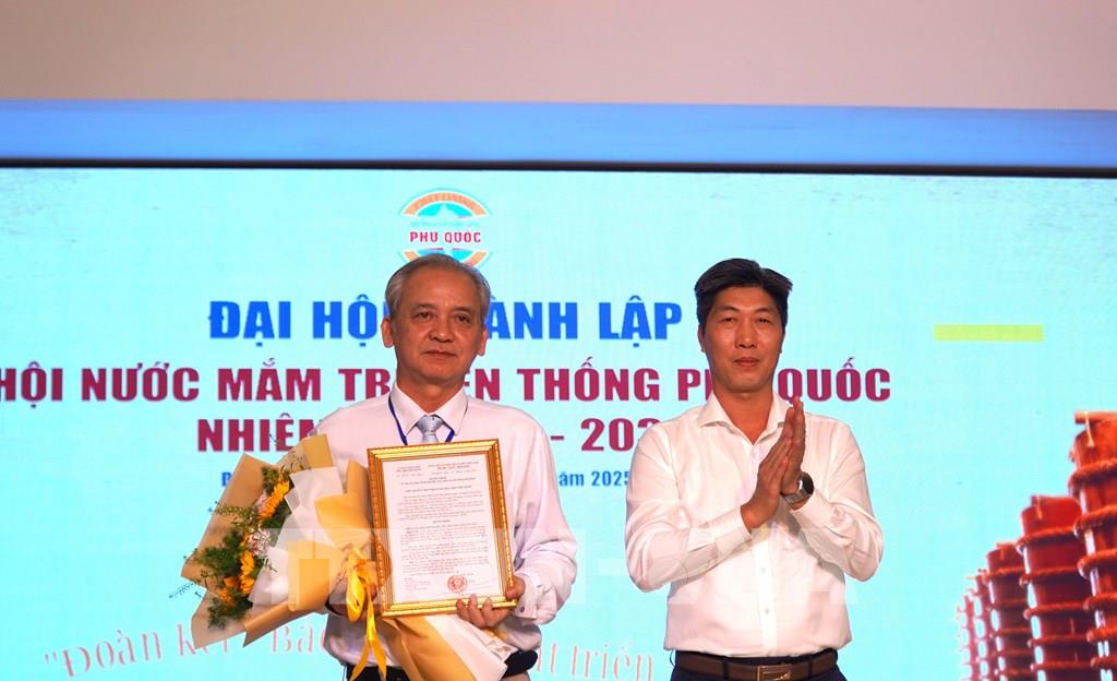 Phó Chủ tịch UBND đặc khu Phú Quốc Nguyễn Lê Quốc Toàn trao quyết định thành lập Hội Nước mắm truyền thống Phú Quốc. Ảnh: Văn Sĩ - TTXVN