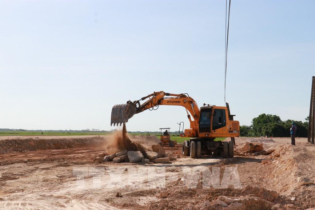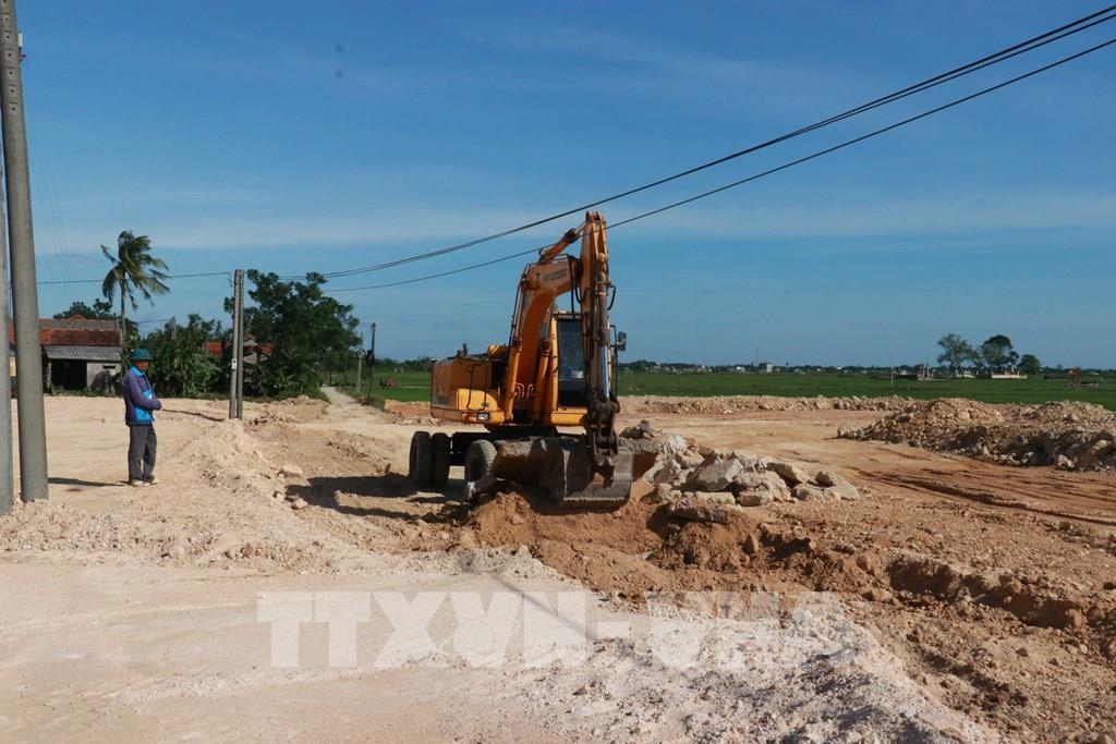 Phương tiện thi công tại khu tái định cư dự án Đường ven biển kết nối hành lang kinh tế Đông Tây ở xã Triệu Bình, tỉnh Quảng Trị. Ảnh: Tường Vi - TTXVN