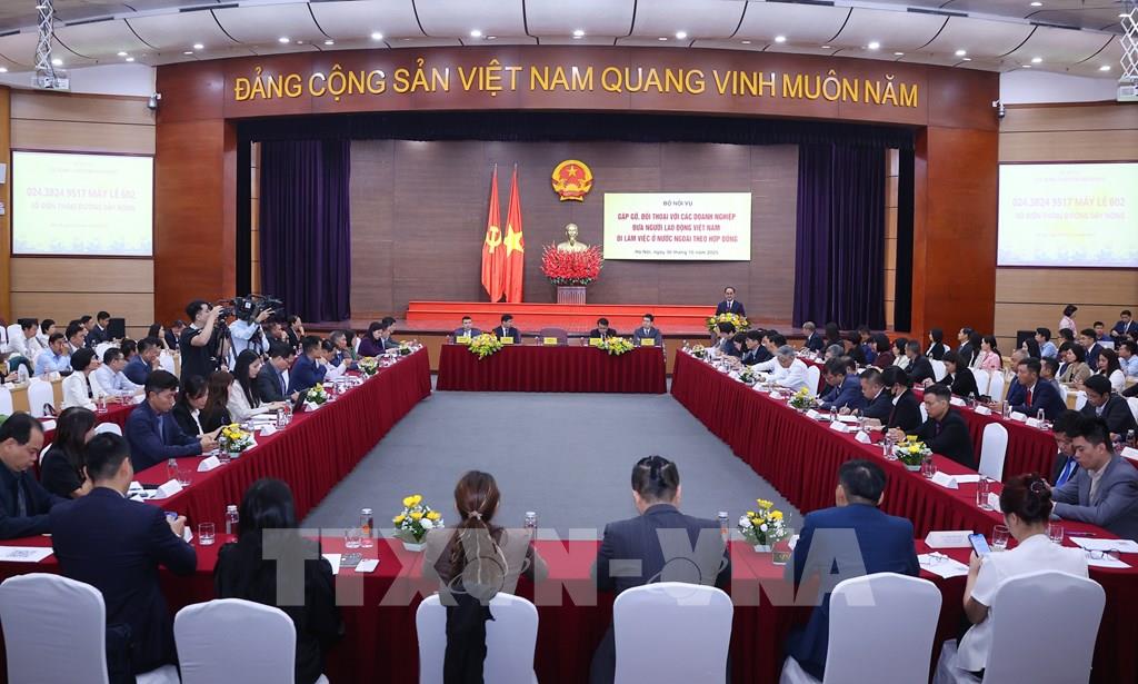 Hội nghị gặp gỡ, đối thoại và tháo gỡ khó khăn cho doanh nghiệp đưa người lao động Việt Nam đi làm việc ở nước ngoài theo hợp đồng. Ảnh: Văn Điệp - TTXVN
