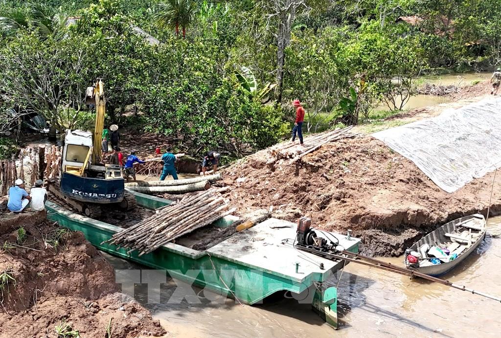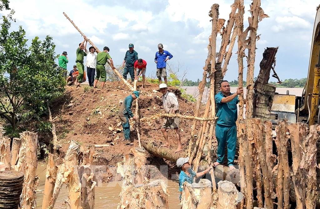 Các lực lượng và người dân phối hợp gia cố đoạn đê bao cồn Thanh Long, xã Quới Thiện, tỉnh Vĩnh Long. Ảnh: Lê Thúy Hằng – TTXVN
