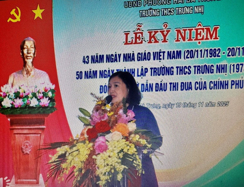 Phát biểu tại Lễ kỷ niệm, Nhà giáo Nguyễn Thị Bích Nga - Bí thư Đảng ủy, Hiệu trưởng trường THCS Trưng Nhị cho biết, 50 năm là một hành trình của bao tâm huyết và đam mê; từ những lớp học đầu tiên còn đơn sơ, các thế hệ thầy cô đã bền bỉ gieo hạt tri thức, nuôi dưỡng những ước mơ lớn. Trải qua bao thăng trầm cùng đổi thay của đất nước, trường THCS Trưng Nhị hôm nay luôn giữ vững nề nếp, kỷ cương, đoàn kết, sáng tạo, là ngôi trường thân thiện, hạnh phúc và chất lượng của phường Hai Bà Trưng cũng như Tp. Hà Nội.