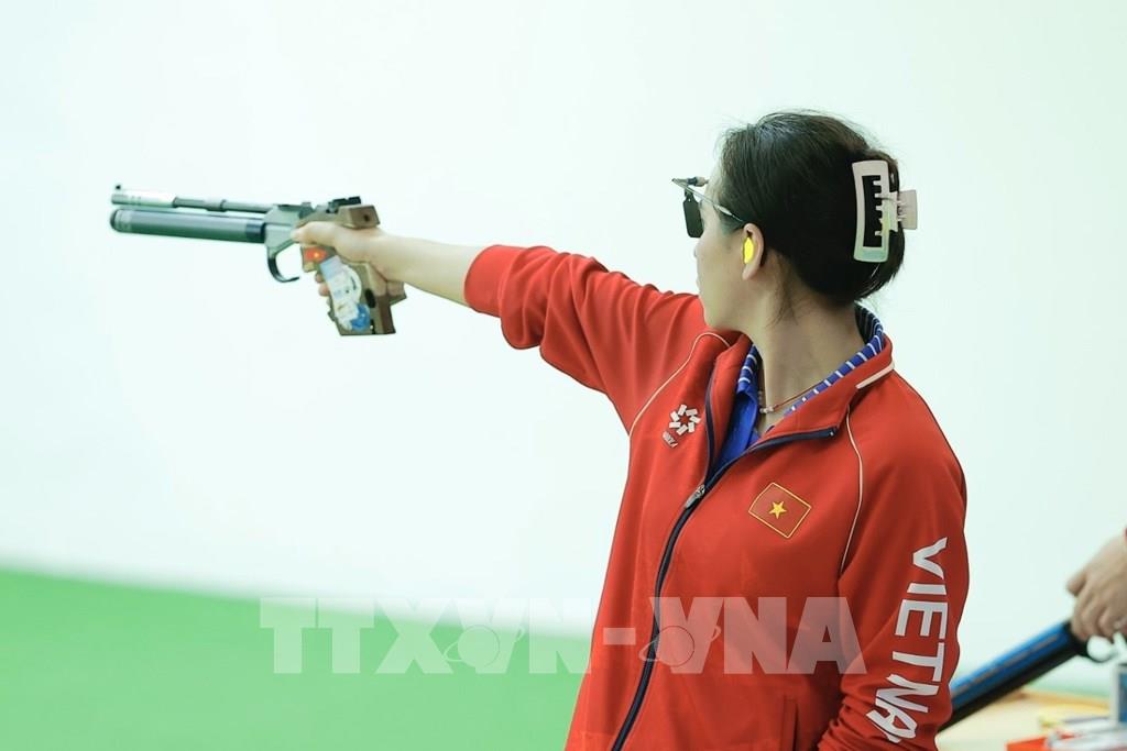 Xạ thủ Trịnh Thu Vinh thi đấu chung kết nội dung 10 m súng ngắn hơi đồng đội hỗn hợp. Ảnh: Minh Quyết - PV TTXVN tại Thái Lan