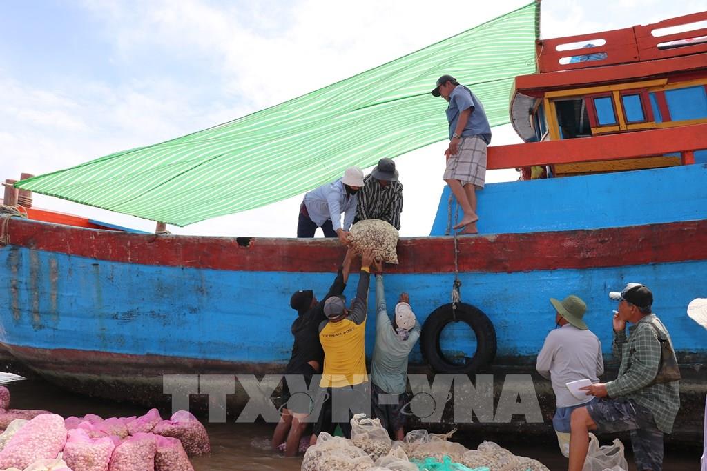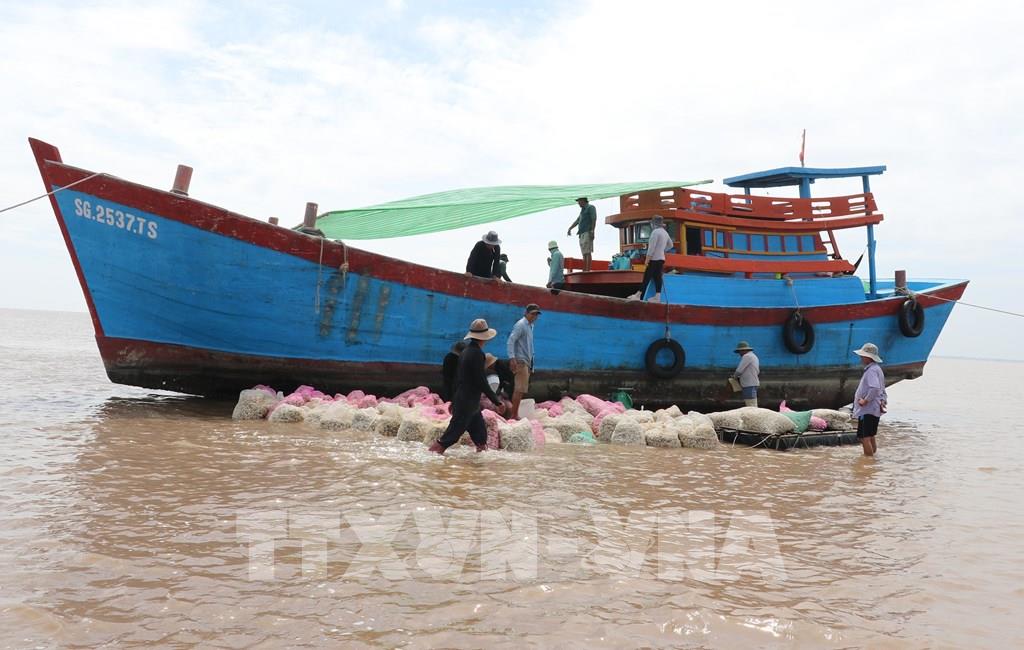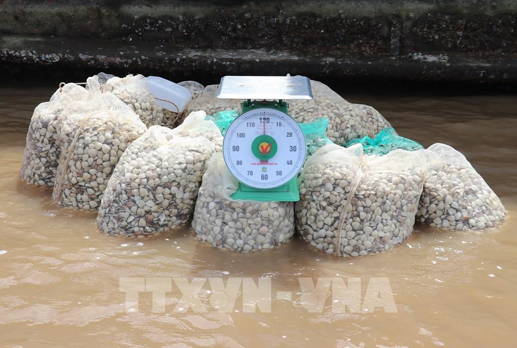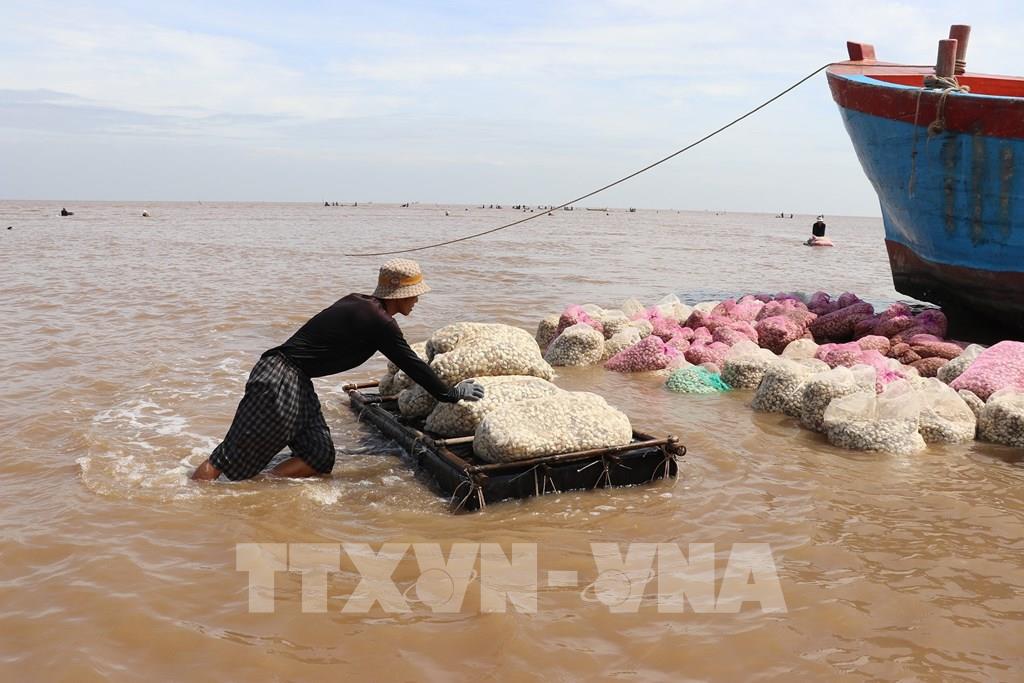 Nghêu sau khi bán cho thương lái sẽ được vận chuyển vào bờ đến nơi tiêu thụ. Ảnh: Hữu Chí - TTXVN
