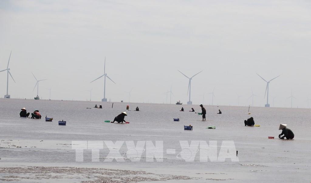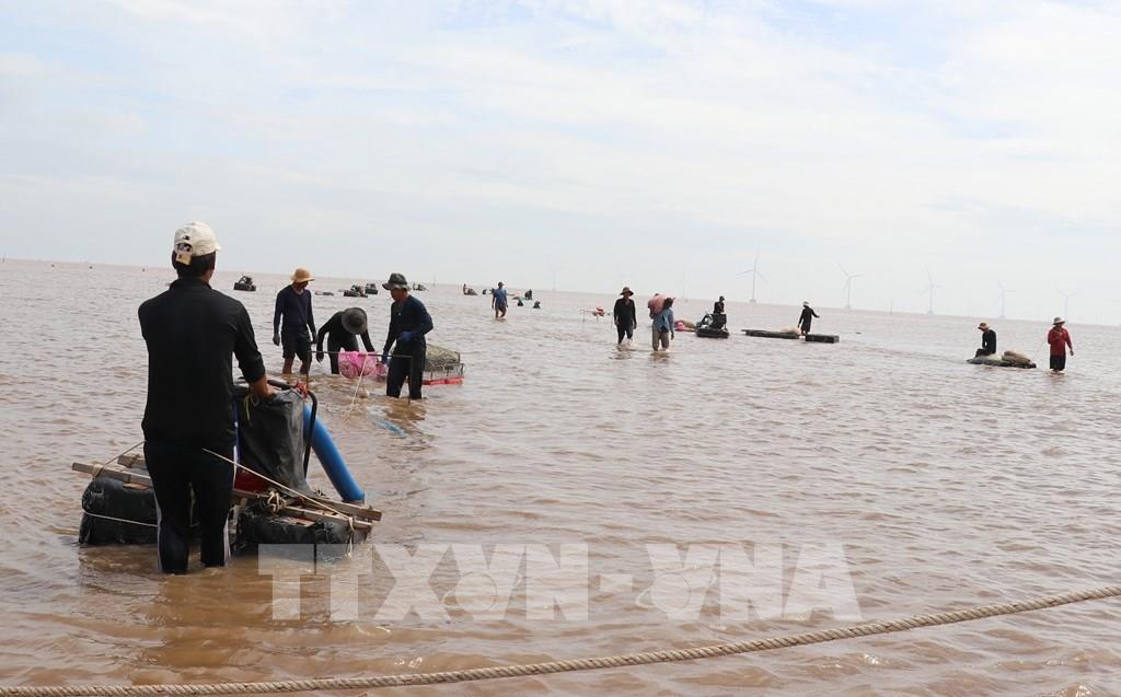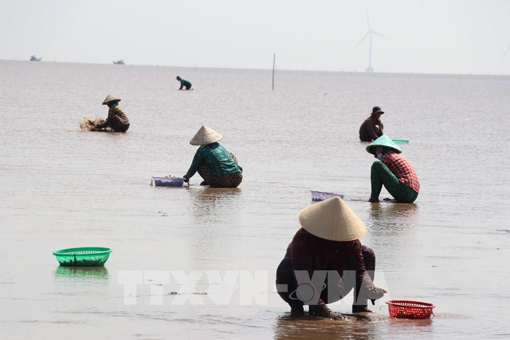 Người bắt nghêu ở một bãi nuôi khi thủy triều vừa xuống. Ảnh: Hữu Chí - TTXVN