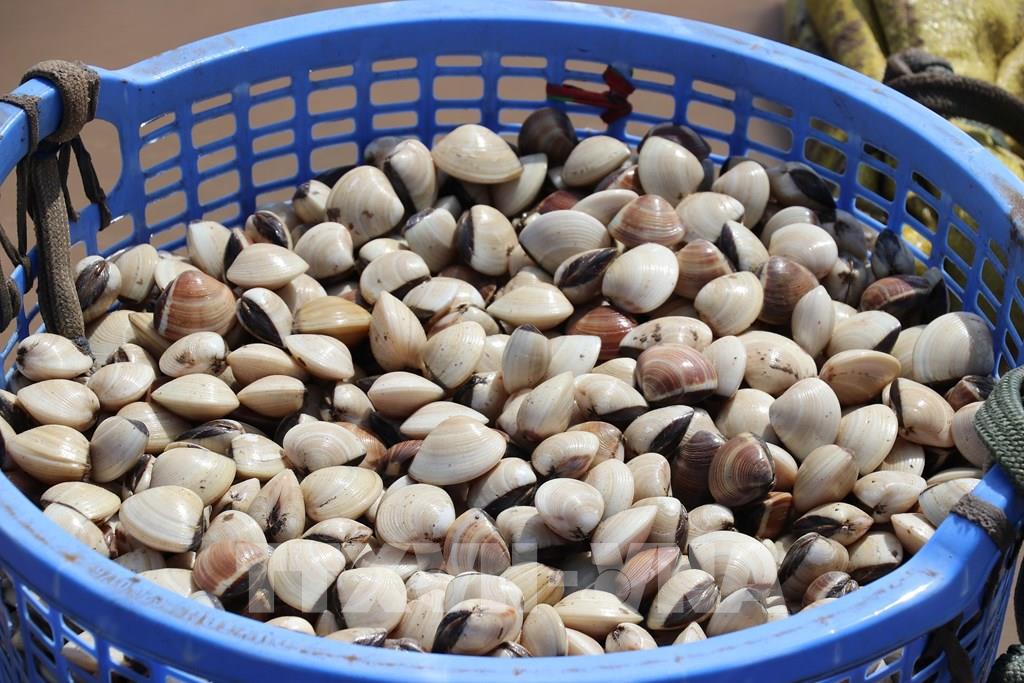 Nghêu sau khi thu hoạch chuẩn bị được bán cho thương lái. Ảnh: Hữu Chí - TTXVN