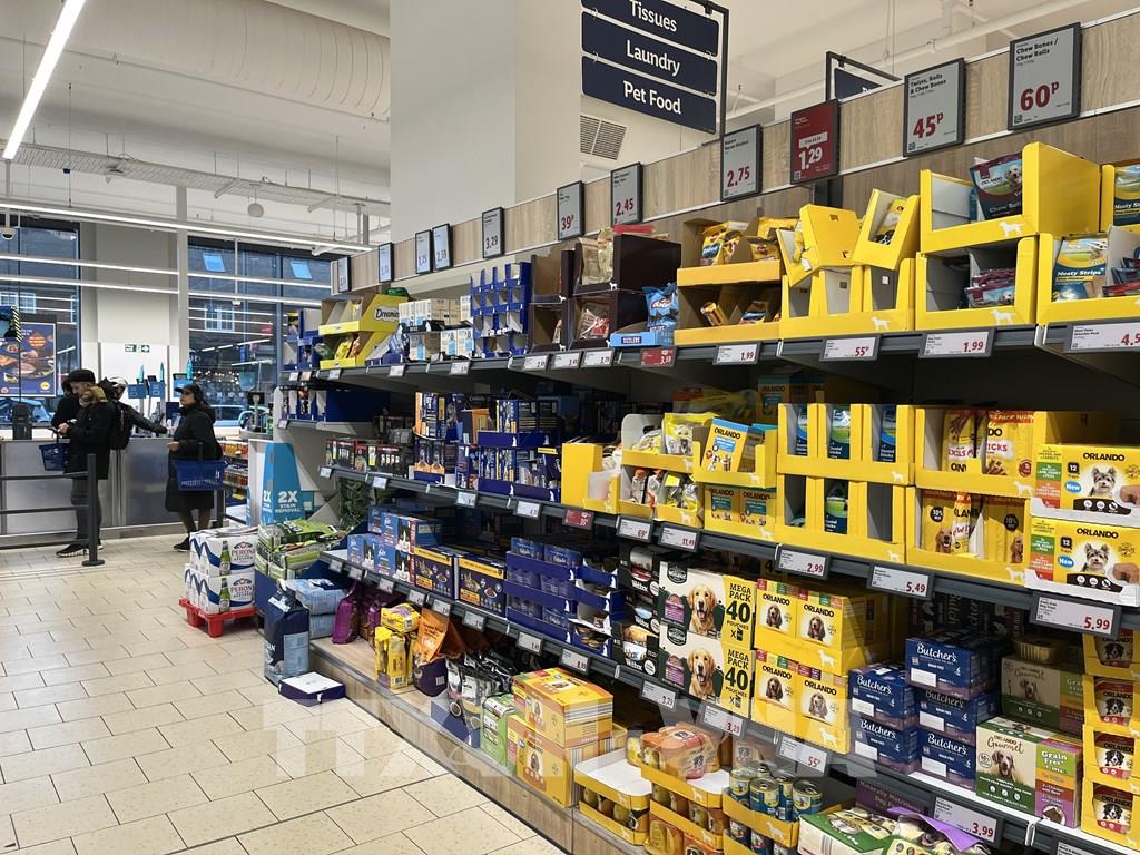 Kệ thức ăn cho thú cưng với nhiều sản phẩm đa dạng tại một siêu thị ở Tây London. Ảnh: Hương Giang - PV TTXVN tại Anh